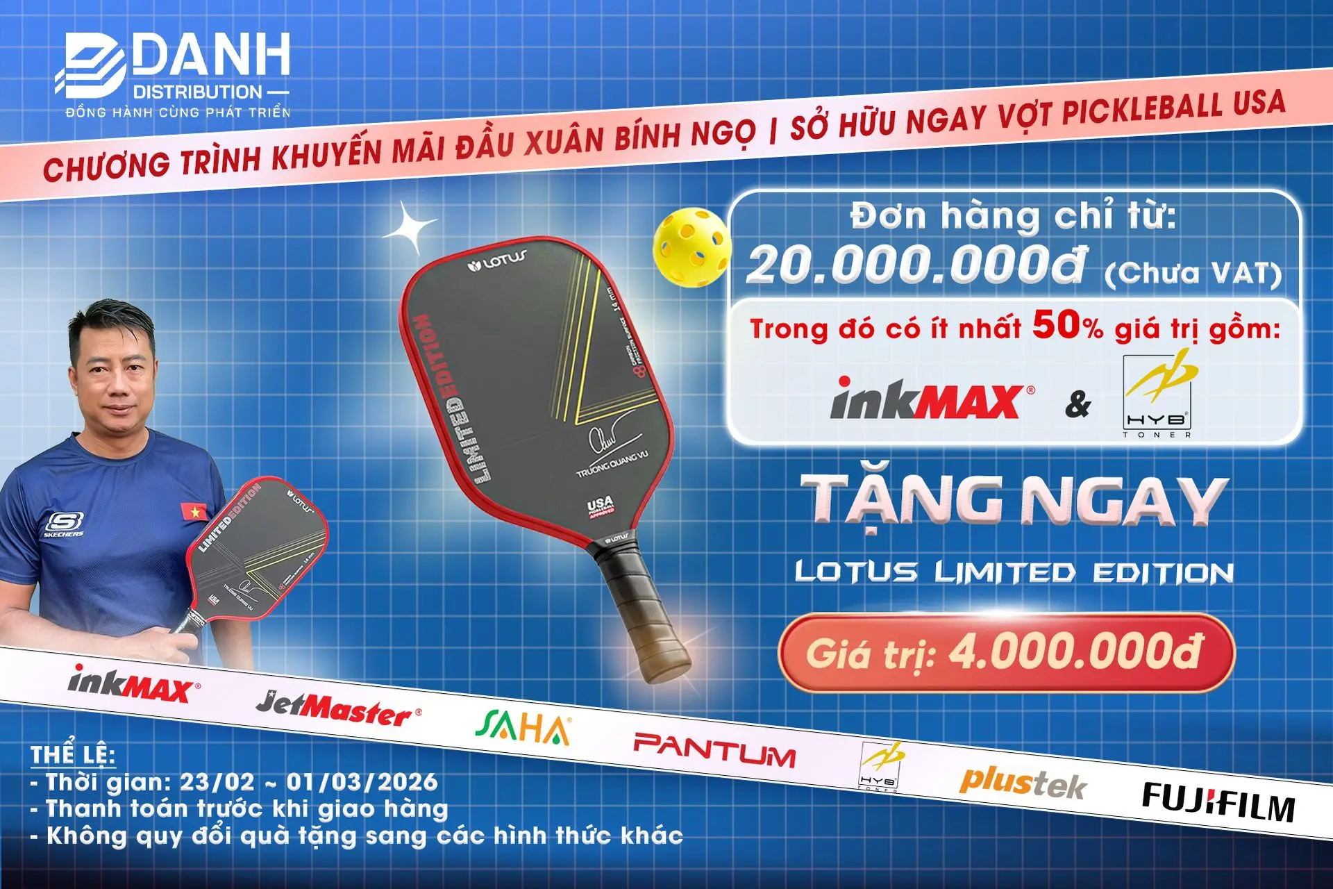 Đầu năm mới Bính Ngọ 2026, Công ty Phân phối Danh khởi động không khí kinh doanh sôi nổi với chương trình khuyến mãi "khủng" dành cho quý đối tác. Không chỉ mang đến những sản phẩm mực in và linh kiện chất lượng, chúng tôi đặc biệt gởi tặng món quà sức khỏe thời thượng: Vợt Pickleball LOTUS Limited Edition.